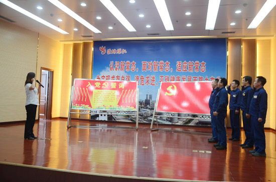 儀式在雄壯的《國際歌》聲中拉開帷幕。新黨員進行了入黨宣誓,老黨員重溫入黨誓詞。全體黨員面對鮮紅的黨旗,舉右手齊肩握拳,神情莊重,在公司黨委委員、人力資源部部長程冬梅的領讀下,進行莊嚴宣誓,洪亮而堅定的聲音回響在禮堂上空。