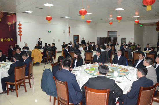 本網訊 金羊呈瑞送冬去,靈猴獻祥迎春來。2月4日晚,公司餐廳二樓宴會大廳內張燈結彩,喜氣洋洋,一派春意融融、歡樂祥和的景象,2016年榮信煤化新春招待會隆重舉行。公司領導、主管、值長以上人員共100多人參加。招待會上大家舉杯共飲,回憶昨天,慶祝今天,展望明天,共同分享喜悅和祝福,喜迎新春佳節的到來。