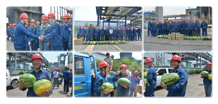7月18日,集團公司總工程師杜漢雙、人力資源部部長程冬梅、工會副主席王乃峰等領導率領慰問組來到生產區,看望慰問奮戰在一線的廣大職工,并為大家送上西瓜、雪糕等防暑降溫慰問品,把清涼送到員工的手上,把集團關懷送到員工心坎。