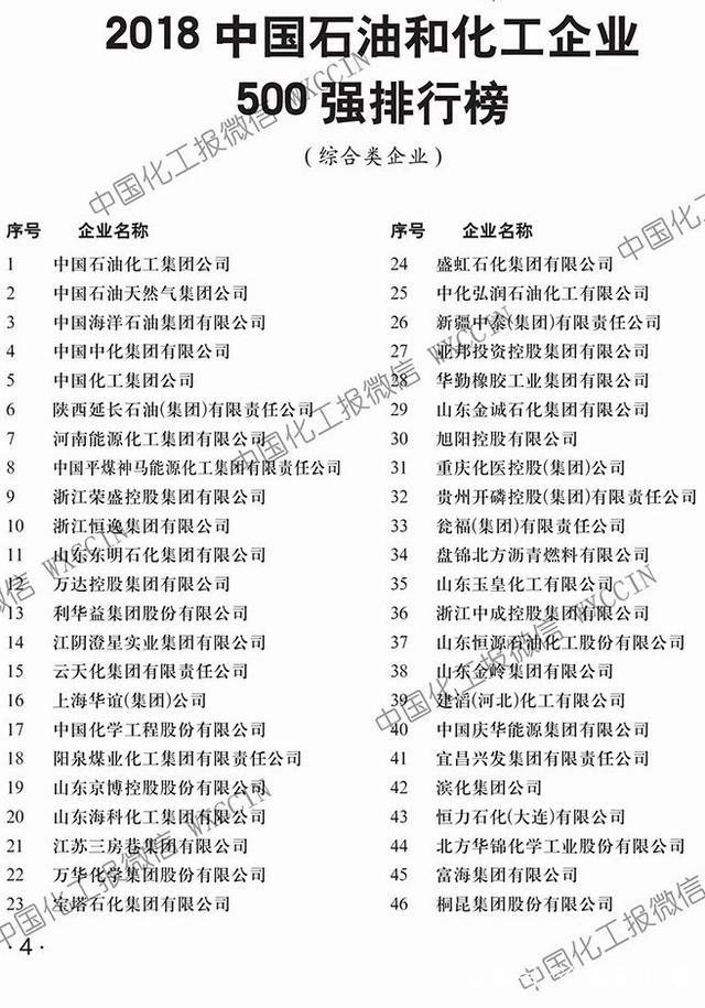 據悉,自2003年以來,中國石油和化學工業聯合會和中國化工企業管理協會已經連續十五年向社會發布了中國化工企業500強排行榜和分析報告,為政府和社會提供了我國化工大企業發展現狀和態勢的獨家權威信息。從2017年起,這個榜單首次將石油和石油煉制行業納入其中,形成了中國石油和化工全產業鏈的組合與發布。該榜單依據年度收入排序的國際慣例,產生了“2018中國石油和化工企業500強”。