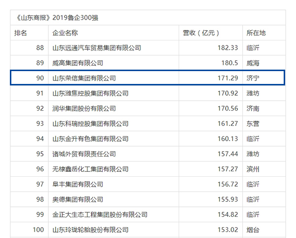 10月29日,“2019魯企300強”榜單發(fā)布,山東榮信集團以171.29 億的營業(yè)收入位列榜單第90位。