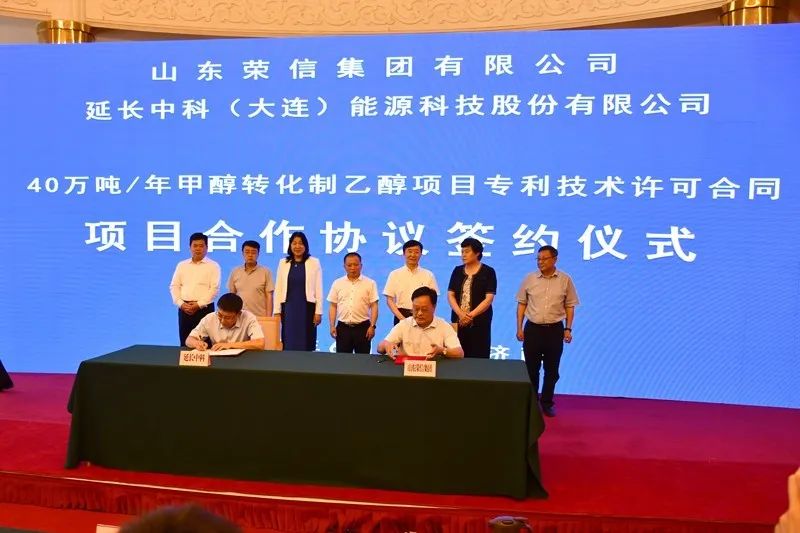 集團總工程師杜漢雙與延長中科(大連)能源科技股份有限公司總經理任曉光分別代表雙方簽署了“40萬噸/年甲醇轉化制乙醇項目專利技術許可合同”。這是山東能源研究院引進落地山東的首個重大產業化項目。